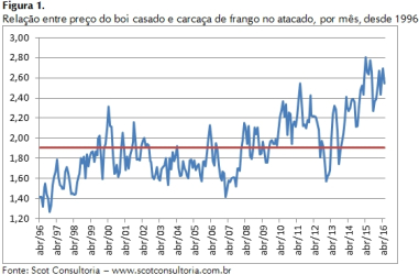 Atualmente, a relação de preço entre o boi casado e a carcaça de frango no atacado está em 2,5, ou seja, com o preço de um quilo de carne bovina é possível comprar 2,5 quilos de carne de frango. Alta de 33,3% quando comparado à média histórica que é de 1,9.